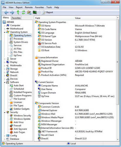 AIDA64 provides over 50 pages of information on installed programs, software licenses, security applications, and Windows settings. Also available are lists of started processes, services, DLL files, startup programs, and visited web pages.
