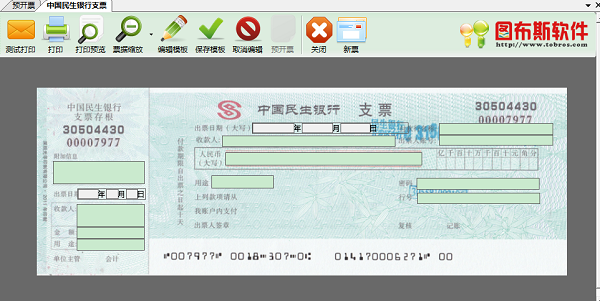 The free version of the check printing software provides printing functions such as bank checks, bank invoices, settlement business applications, business power of attorney, wire transfer vouchers, acceptance drafts, collection vouchers, cash deposit slips, credit vouchers, payment vouchers, intra-city business payment vouchers, cash payment slips, and various express delivery slips.