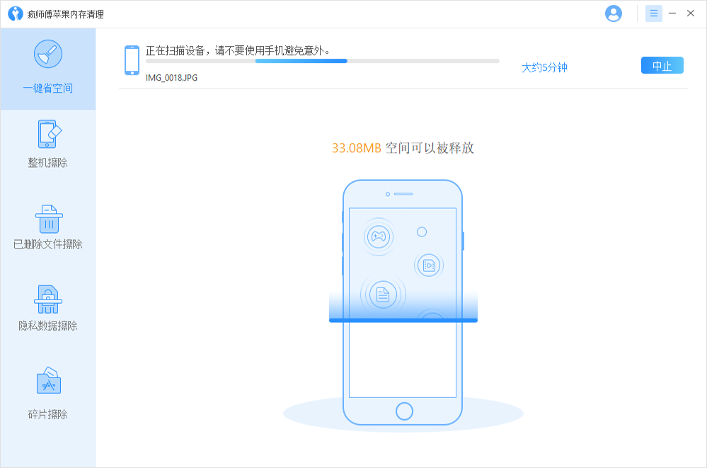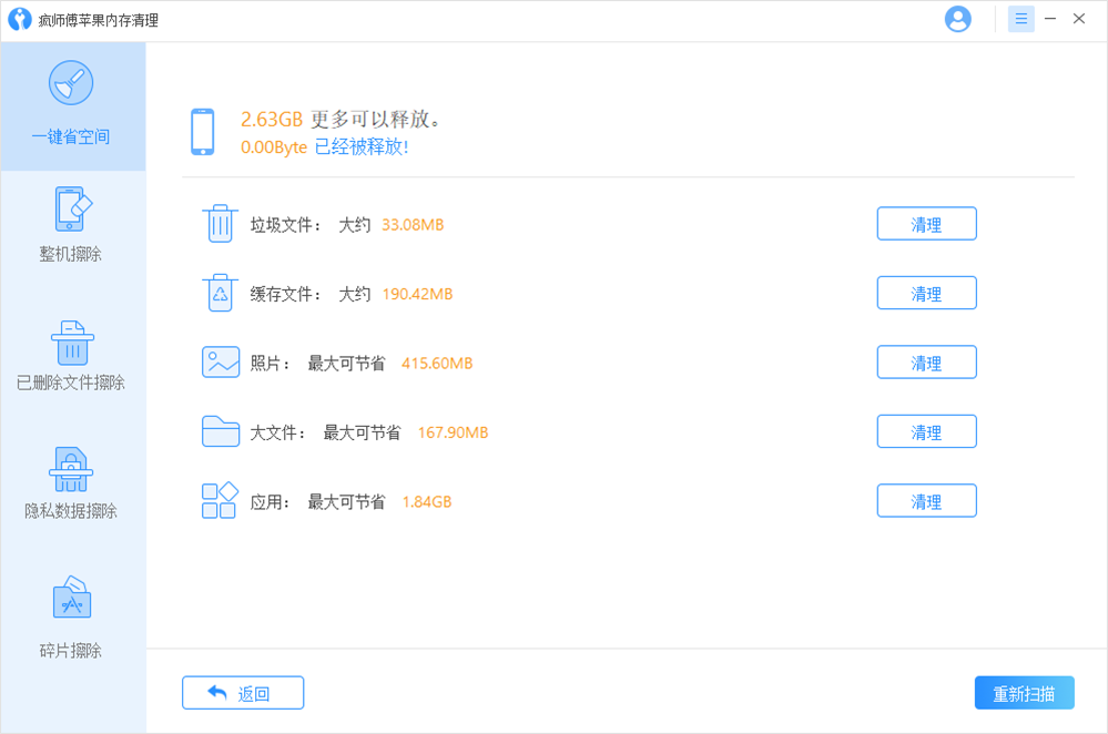 If you only want to scan a single module to free up iPhone memory, you can do so through this function. The feature has 5 categories: Clean Junk Files, Clean Temporary Files, Compress Photos, Delete Large Files and Delete Apps. (Note: To ensure the normal operation of the software, please ensure that the connection between the Apple device and the computer is stable during the cleaning process.)