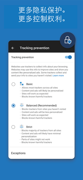 • NEW! Tracking Prevention blocks trackers from sites you don’t visit directly. This feature is enabled by default, so you don't need to take any action for a more private browsing experience.