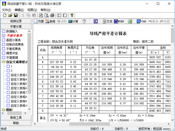 > 4. Calculate the results. The software provides complete and detailed results. The tables provided by default include: plane adjustment calculation table, elevation adjustment calculation table, control point results table, adjustment results table, accuracy evaluation table (including each point error, error between adjacent points, error ellipse parameters, all azimuth angle errors, side length errors, side length relative errors, etc.), plane error check table, etc. In addition to providing the default results table format, it also supports user-defined table styles to adapt to different needs. The graphics provided by this software include: plane error checking graphics, wire diagrams, and point diagrams.