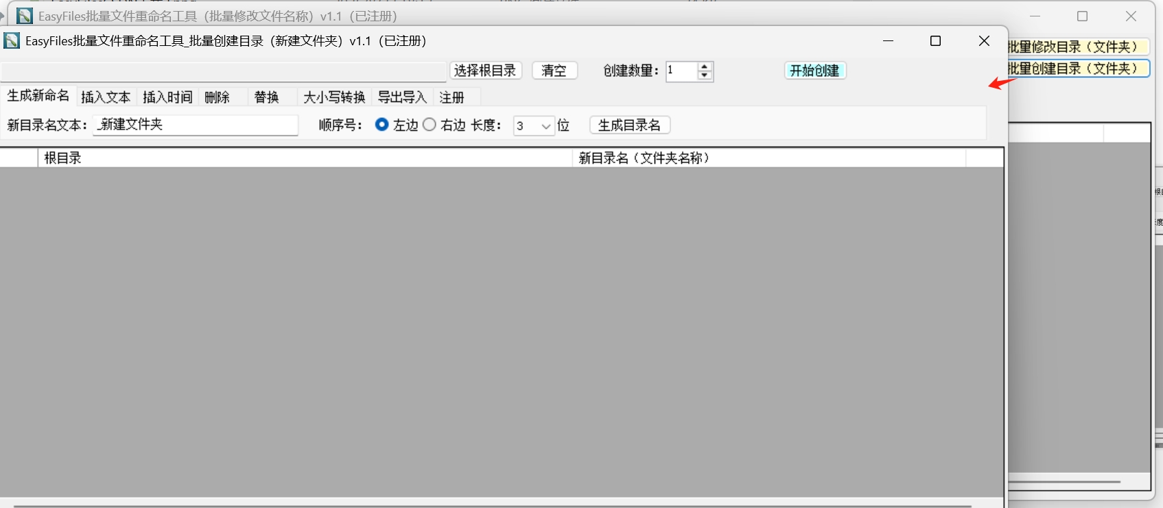 Version v1.1 supports batch creation of directories (folders) and batch renaming of directories (folders), including automatically generating sequence numbers, inserting specified text, inserting date and time, deleting specified text, replacing text, case conversion, modifying folder time attributes (creation time, modification time, access time), import and export, etc.