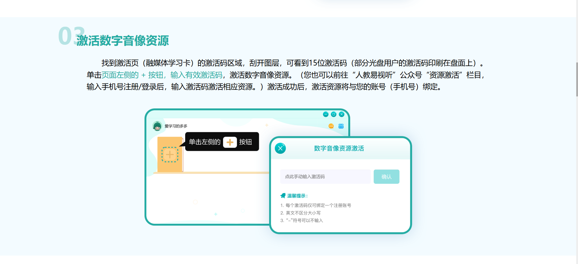 Find the activation code area of the activation page (Integrated Media Learning Card), scratch off the layer, and you can see the 15-digit activation code (the activation code of some CD-ROM users is printed on the disk). Click the + button on the left side of the page, enter a valid activation code, and activate digital audio and video resources. (You can also go to the "Resource Activation" section of the "People's Education Easy Audiovisual" public account, enter your mobile phone number to register/log in, and enter the activation code to activate the corresponding resources.) After successful activation, the activated resources will be bound to your account (mobile phone number).