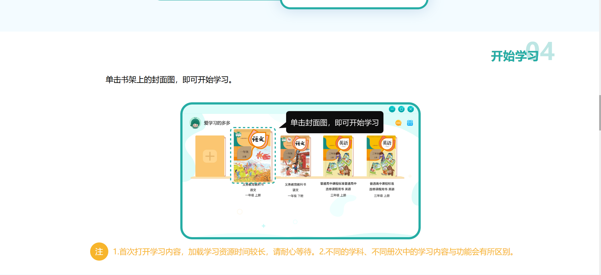 Note: 1. When opening the learning content for the first time, it will take a long time to load the learning resources, so please wait patiently. 2. The learning content and functions in different subjects and volumes will be different.