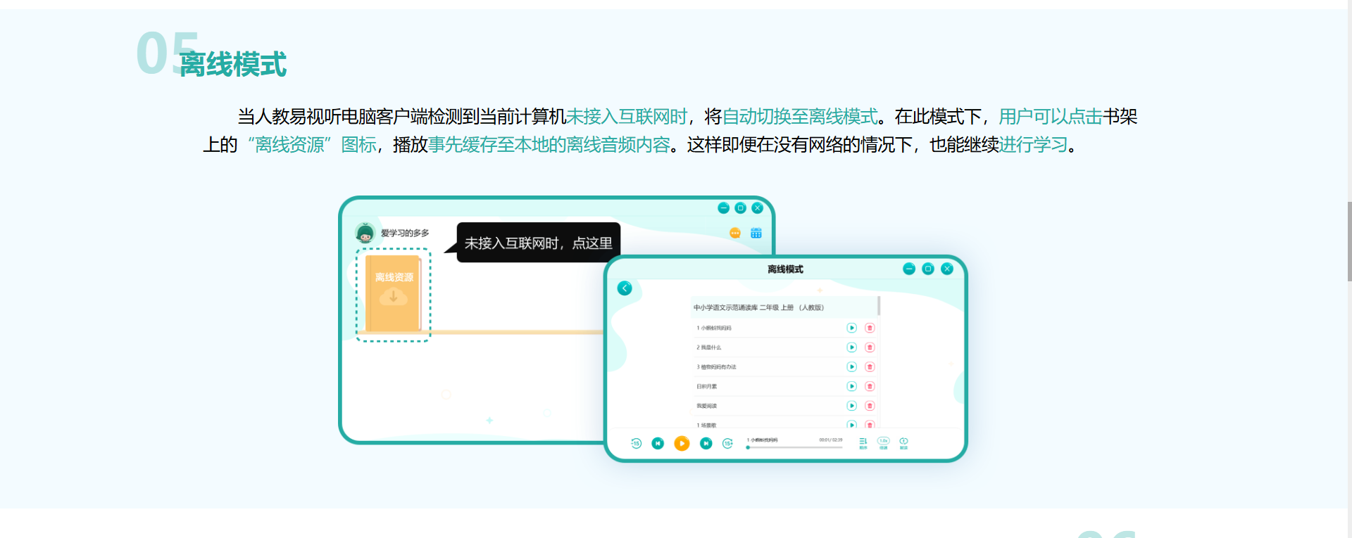 When the PC client of Renjiaoyi Audio-Visual detects that the current computer is not connected to the Internet, it will automatically switch to offline mode. In this mode, users can click the "Offline Resources" icon on the bookshelf to play offline audio content that has been cached locally. This way you can continue learning even without the Internet.