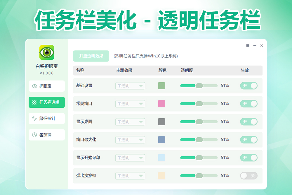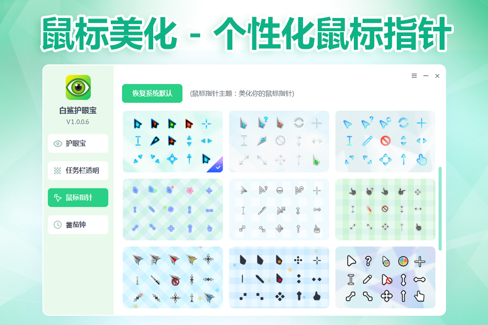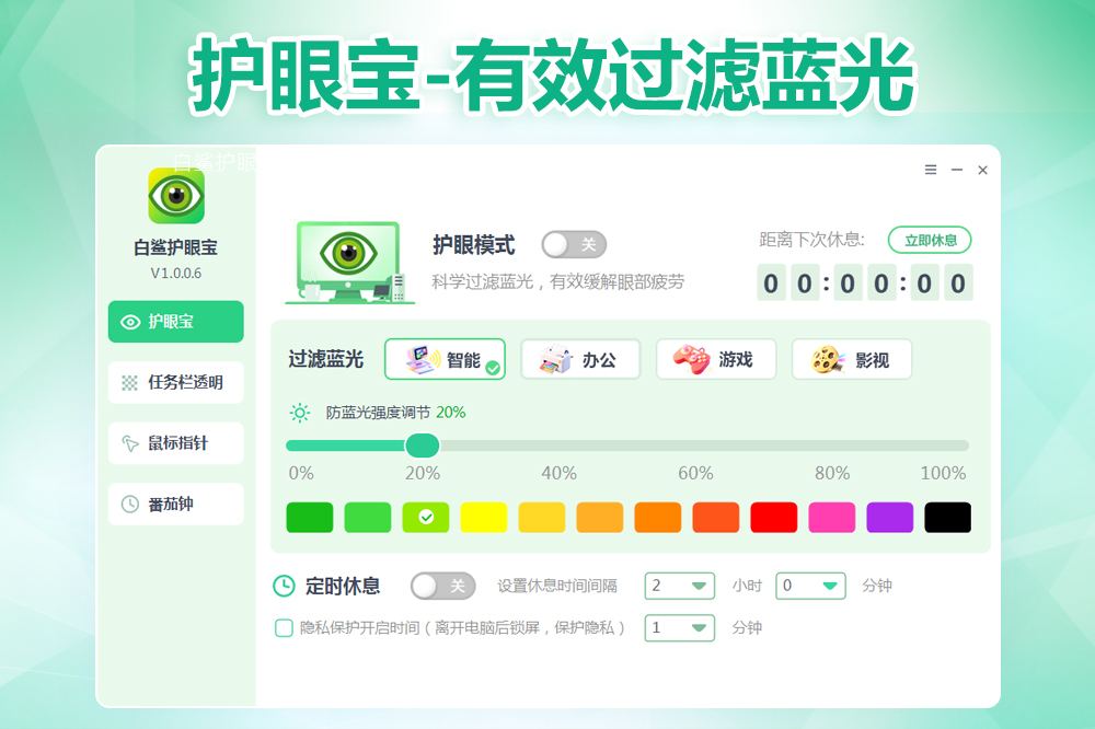 White Eye Protector effectively prevents blue light, transparent taskbar, beautifies mouse pointer, Pomodoro and other functions. It supports intelligent eye protection, office eye protection, gaming eye protection, and film and television eye protection. It provides more accurate eye protection. It intelligently filters blue light, intercepts 90% of screen blue light, and protects eyes starting from the screen. White Shark Eye Protector protects your computer screen.