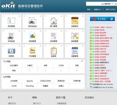 In terms of project management, oKit provides necessary functions such as project group management, project line monitoring, plan management, task management, configuration management, requirements management, test management, defect management, project forum, memorabilia management, etc. In addition to project management, oKit also provides a series of simple and easy-to-use organizational management functions, such as instant messaging (IM), knowledge asset management, performance appraisal management, department management, contract management, message management, regular report management, etc.