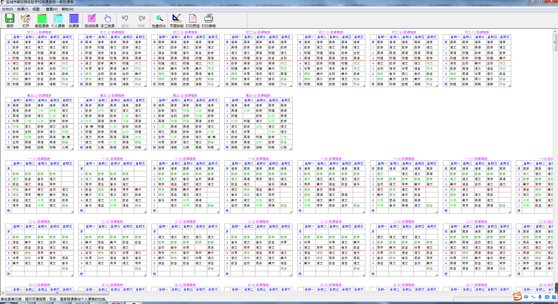 6. A mode switching button has been added to the "Total Class Schedule" view, which can display the class schedule of each class in the school, or the class schedules of all teachers in the school. At the same time, manual adjustment and manual class scheduling are supported in the teacher mode, which is greatly convenient for schools that like manual class scheduling.
