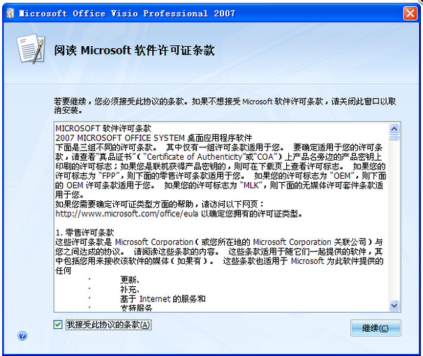 3. Then read the software-related license agreement. If you have no objection, check "I accept the terms of this agreement" on the lower left, and then click "Continue".