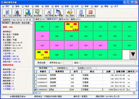 Currently, the modules include: reservation management, reception management, account management, checkout management, guest room management, data query, statistical reports, statistical analysis, night review management, system maintenance, member management, phone billing, door lock interface, and second-generation ID card reading interface.