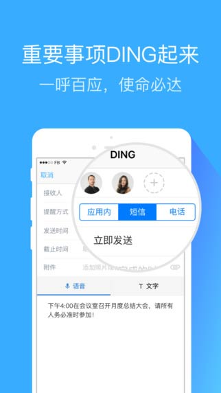 【DING, the mission will be achieved】For urgent or important matters, you can send a DING message, and it will be 100% delivered to the other party through several methods such as in-app, phone or SMS.