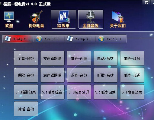 3. After entering the main interface, you will be prompted to set the homepage. Please set it and lock it (method: Settings - Lock Homepage), so that it will not pop up next time. The main interface includes welcome page, rack electronic sound, KX effects, host sound effects, about us and settings. Click on the rack electronic music, select your corresponding system and sound card, and then click on the corresponding effect, you can use the various effects of extreme one-click electronic music. As shown in the picture.