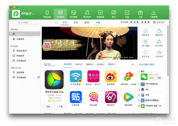 6. Open the PP assistant interface introduced in the introduction. After connecting the IOS device, you can download a variety of applications in genuine applications or jailbroken applications.