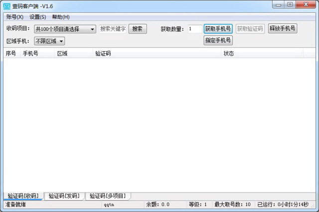 1. Enter the main interface of the Yima SMS platform software, as shown in the figure below. At the bottom of the interface, there are three options: verification code (receiving code), verification code (sending code), and verification code (multiple items). In the verification code (receiving code) interface, you can set the code collection item, acquisition quantity, regional mobile phone and other options to receive the verification code.