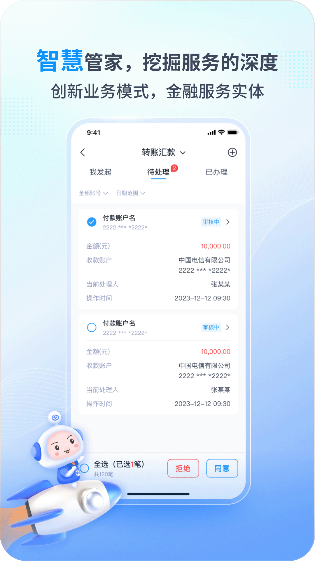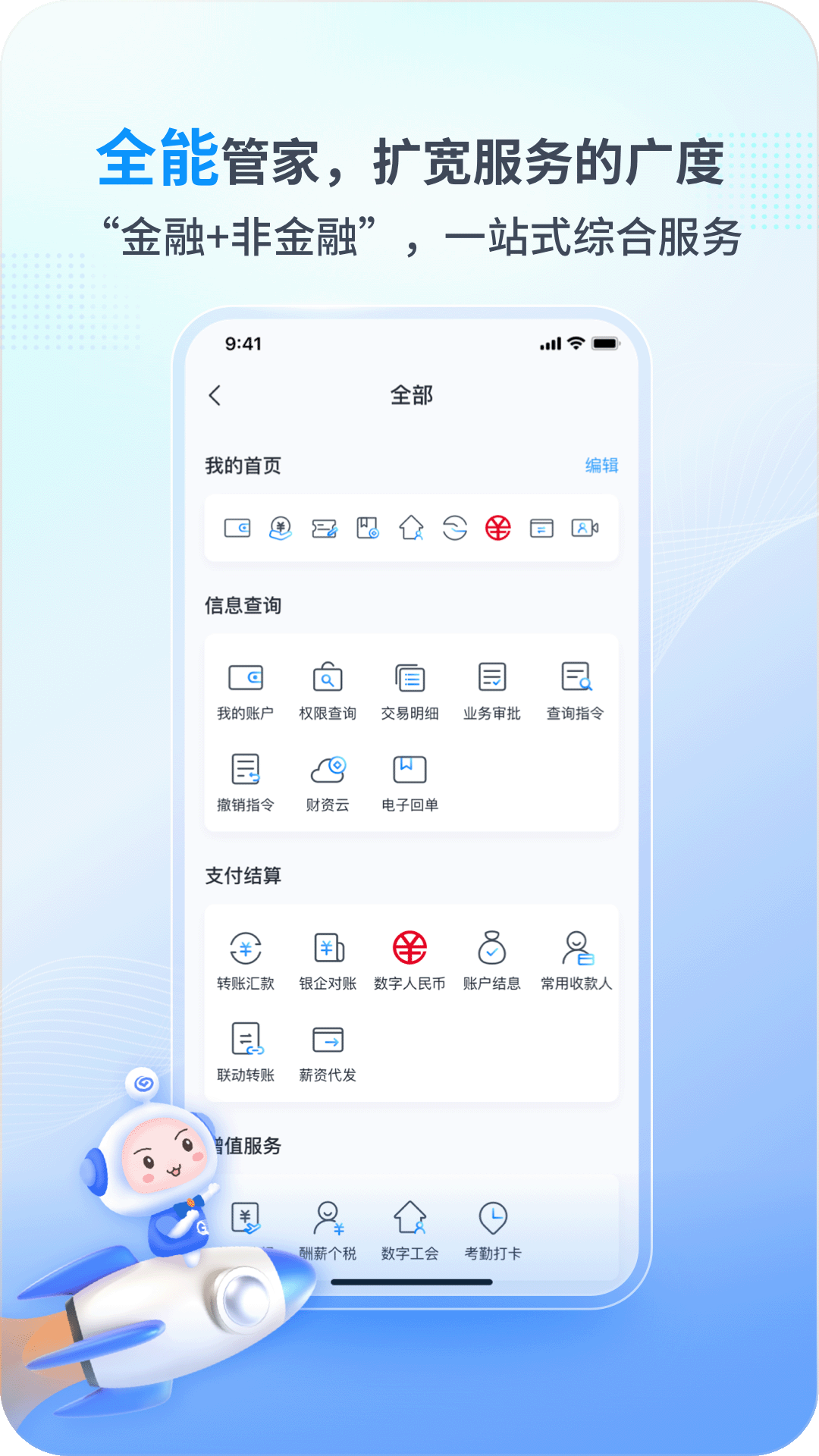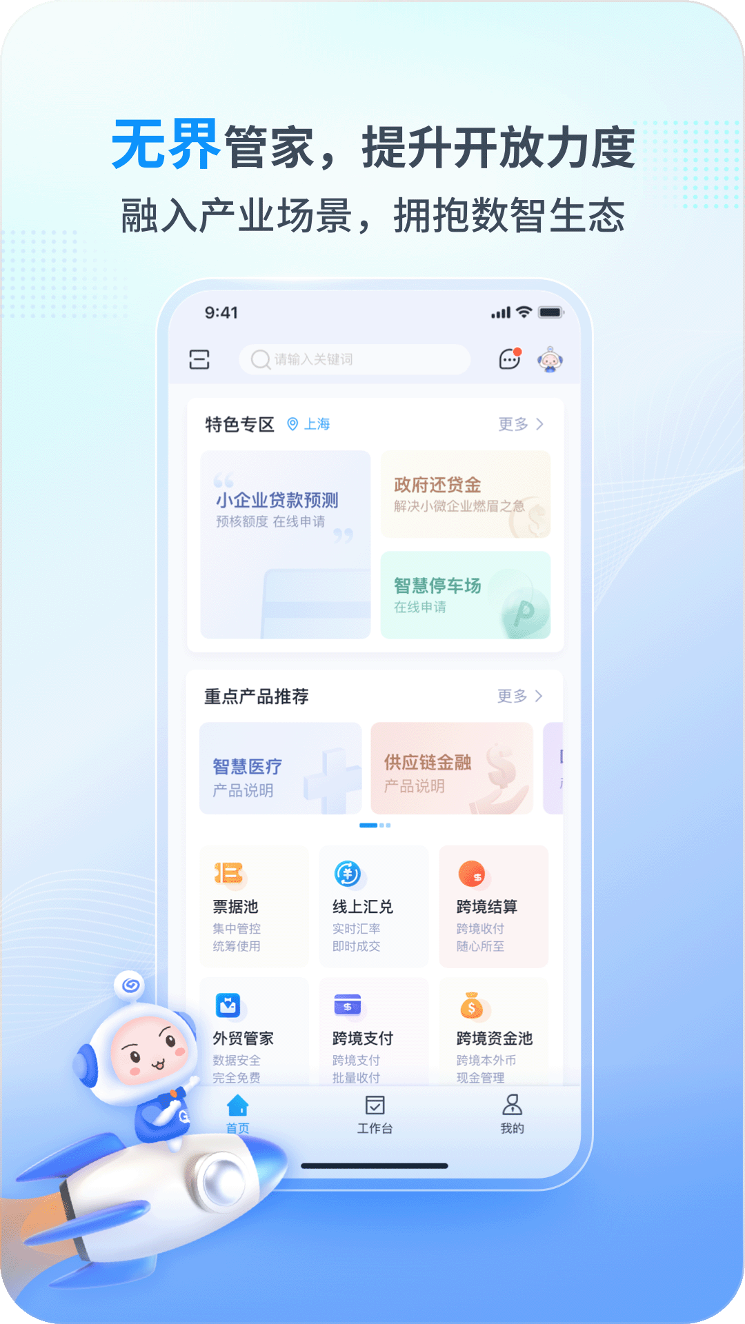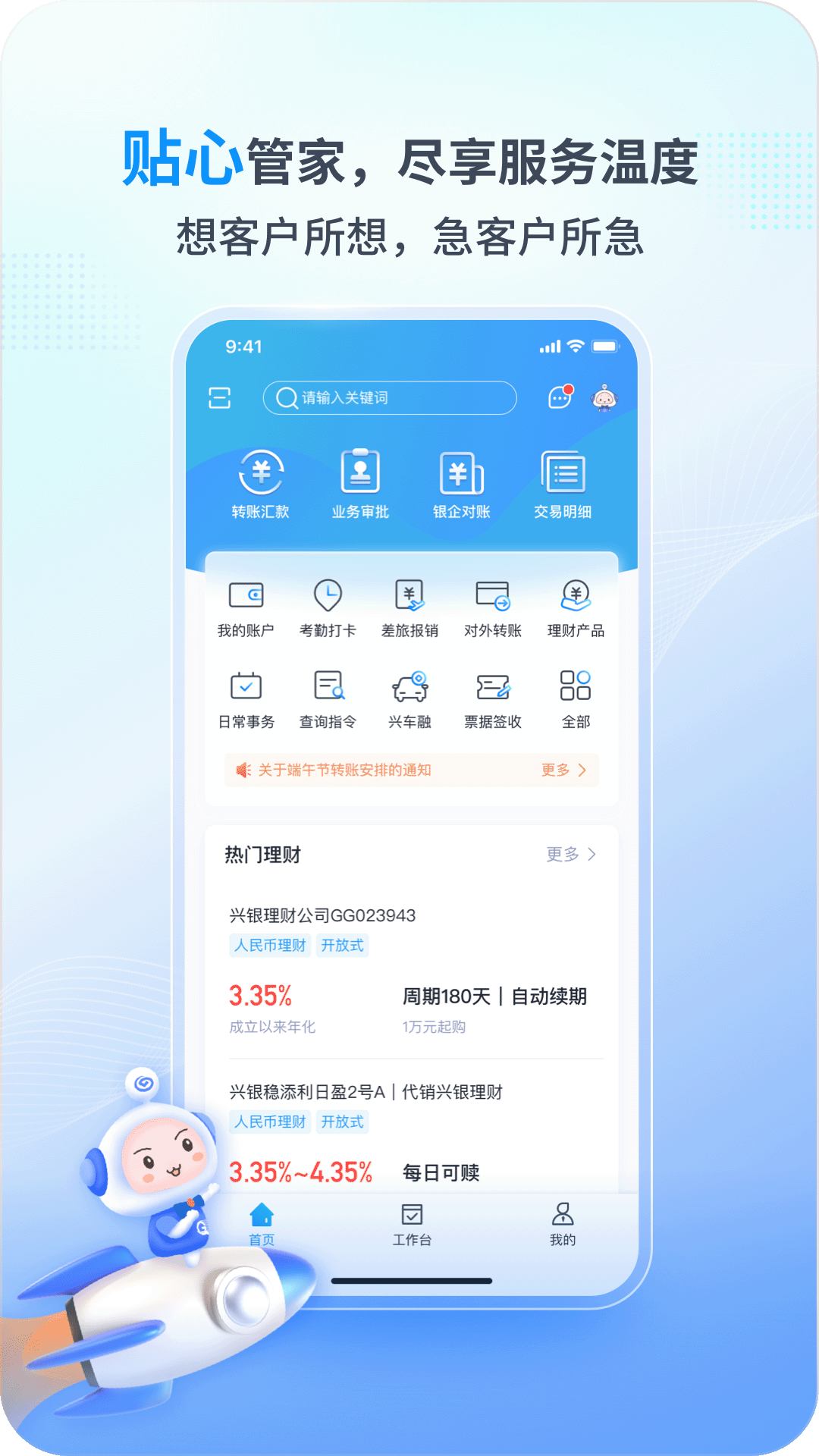 Advantage 1. Money management is convenient and safe. Payment and settlement are more comfortable: customized financial process, flexible and diverse transfers, and one-click completion of agency financing. Financing services are more comfortable: online self-service application, automatic quota approval, and withdrawals arrive in seconds. Wealth management is more worry-free: selected exclusive financial management, convenient application and redemption, easy wealth appreciation. Security guarantee is more reassuring: "Biometric + digital certificate", the service is safe and convenient, third-party authoritative certification, and full encryption escort.