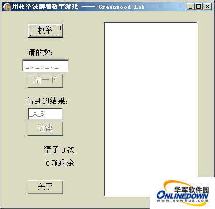1st floor Huajun netizen 2007-11-01 20:54:35The interface design of guessing number games using enumeration (exhaustive) method is very easy to use and has rich functions. I highly recommend it!