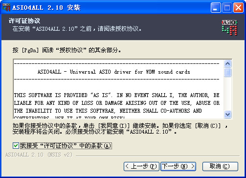 3. Read the ASIO4ALL software-related license agreement. If you have no objection, click to check the "I accept the terms in the "License Agreement"" option on the lower left, and click "Next".