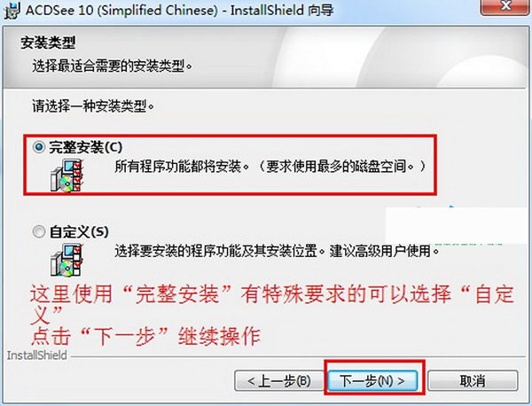 Step 5: The installation type of ACDSee10.0. Here we generally use "Complete Installation". If you have special requirements, you can select "Custom" and click "Next".
