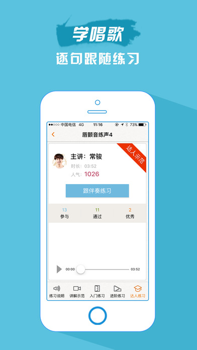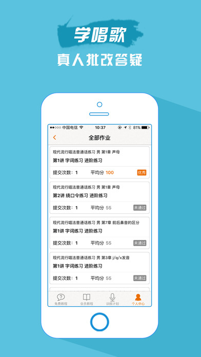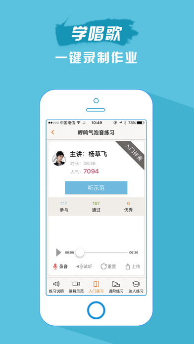 "Member Tutorial" is an extraordinary singing learning experience. It is so simple to have the singing skills of a powerful pop singer. There are a large number of popular vocal etudes. Each exercise is divided into explanations and demonstrations, introductory exercises, advanced exercises, and expert exercises. Each vocal accompaniment has been carefully arranged and produced and perfectly demonstrated by professional pop singing masters. You can practice following professional demonstrations and sing along line by line, or you can record and upload the recording for the teacher to review and grade, just like having a professional vocal teacher practice with you in a music school classroom. It is a must practice for music lovers who want to participate in The Voice of China, Happy Girls, Come on Girls, Burning Boys, and Tianyu trainees.