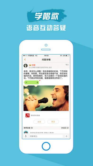 "Singing Q&A" singing Q&A module, you can use text, voice, etc. to ask questions to the teacher, or you can post your own songs and ask for comments and guidance from the teacher. Professional popular singing vocal instructors will patiently explain to you in text or voice, and will recommend exercises or training plans that are suitable for you. It supports adding song recordings recorded by mobile KTV music software such as Changba, National Karaoke, Kuwo Karaoke, Tianla Karaoke, Sing Hui, Haosang, VV Music, Huanshang, Migu Ai Sing, Ku Gou Music, K Song Master, Ai Sang, Yusi Classroom and other mobile KTV music software. It not only scores the singing score, but more importantly, helps you quickly improve your singing level. It is more valuable than directly sharing to social platforms such as WeChat, QQ, Weibo, Douban, Zhihu, etc.