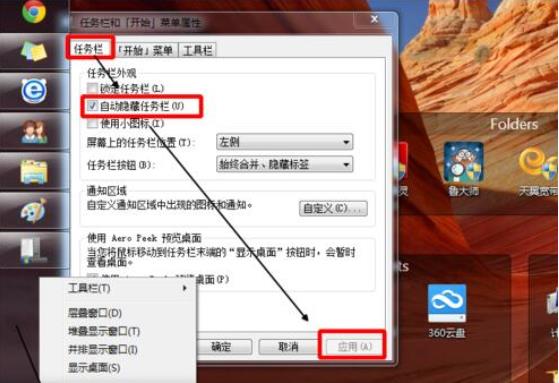 6. If you feel uncomfortable with the taskbar, you can also set it up to hide the taskbar. We right-click the taskbar and click the "Properties" option to enter the taskbar properties interface, as shown in the figure below. We check the "Auto-hide taskbar" option in the interface, and then click Apply. After completion, click OK to hide the taskbar.