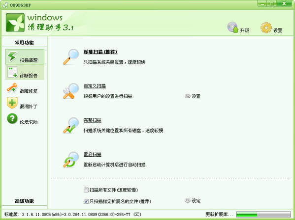1. Open the installed Windows Cleanup Assistant. In the commonly used function column, you can see 6 functions: "Scan Cleaning", "Diagnostic Report", "Fault Repair", "Trace Cleaning", "File Operation" and "Cleaning Related".