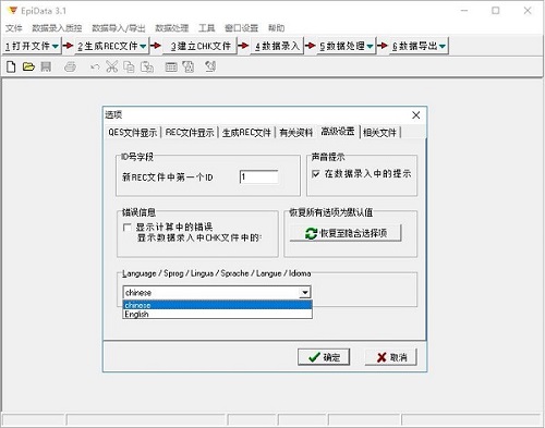 6. Data processing, providing data processing functions such as displaying the REC file structure, memos about data entry, data list (each record is a row), data list (each record is a paragraph), simple data analysis table, consistency test (difference comparison after double entry of the questionnaire), reliability test (quality control of the entered REC file), and counting the number of records by fields.
