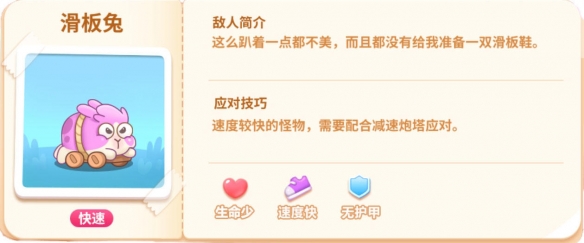 The Skateboard Rabbit lies on the skateboard, so it is very fast, but it has the characteristics of low life and no armor. If a skateboard rabbit appears in the game, we need to build a [slowdown turret] to reduce its speed and defeat it quickly.