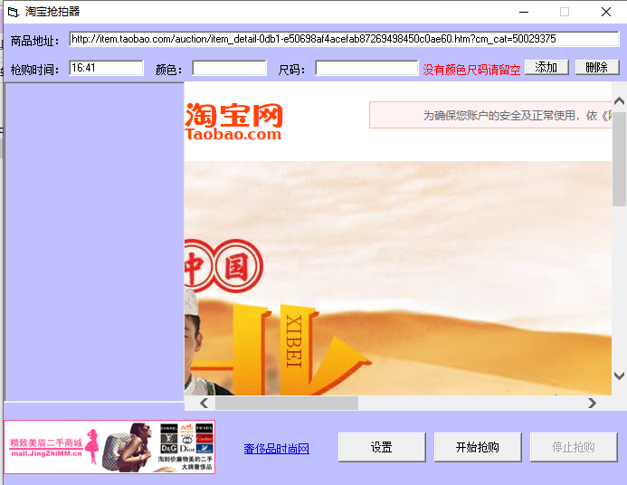 2. Next, we copy the link address of the product we need to grab on Taobao. After copying, click the Add option on the Taobao Flash Sale software interface, paste the link into the product address bar, and then we start the next step.