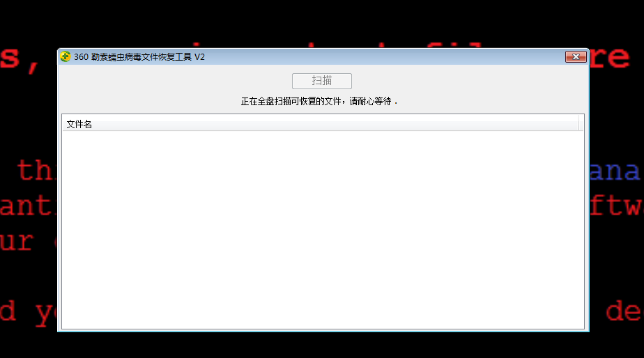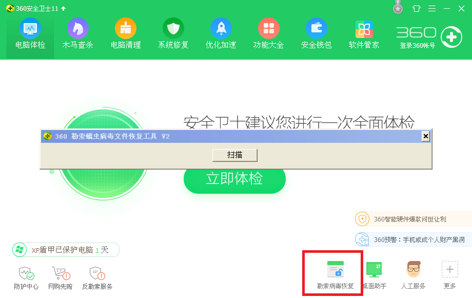 2. After restarting the computer, perform a full scan to completely remove the ransomware virus (antivirus will not modify the desktop wallpaper left by the virus, you need to set your favorite wallpaper yourself). Then click the "Ransomware Recovery" icon on the main interface of 360 Security Guard, open the "360 Ransomware Worm File Recovery Tool V2", and click the scan button:
